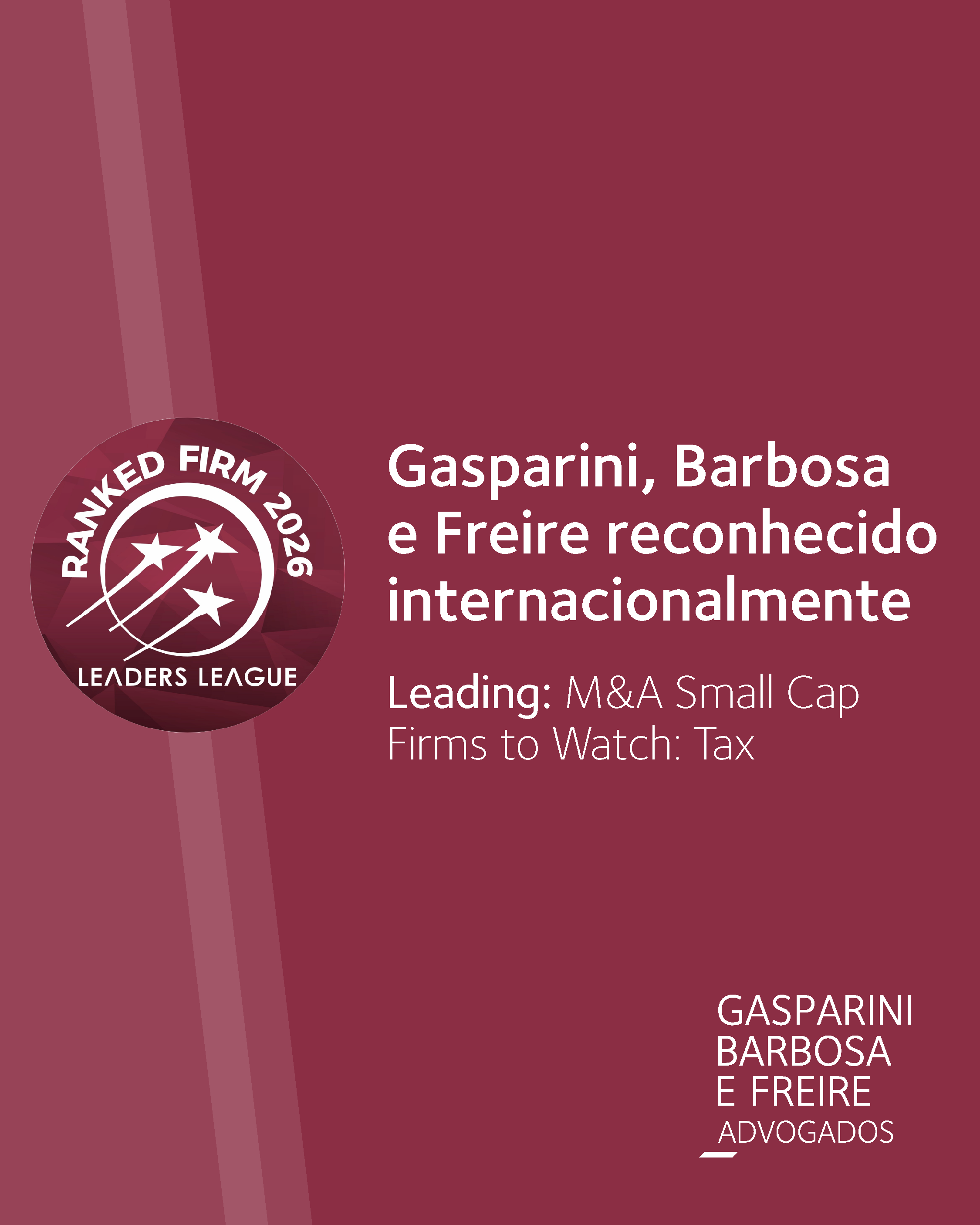 Leaders League destacou o Gasparini, Barbosa e Freire Advogados na edição 2026 do ciclo Transactional, reconhecendo o escritório como Líder em M&A Small Cap e Firm to Watch na prática de Tributário. Agradecemos aos Clientes e às equipes do Escritório pelo requerimento alcançado. — Leaders League highlighted Gasparini, Barbosa e Freire Advogados in the 2026