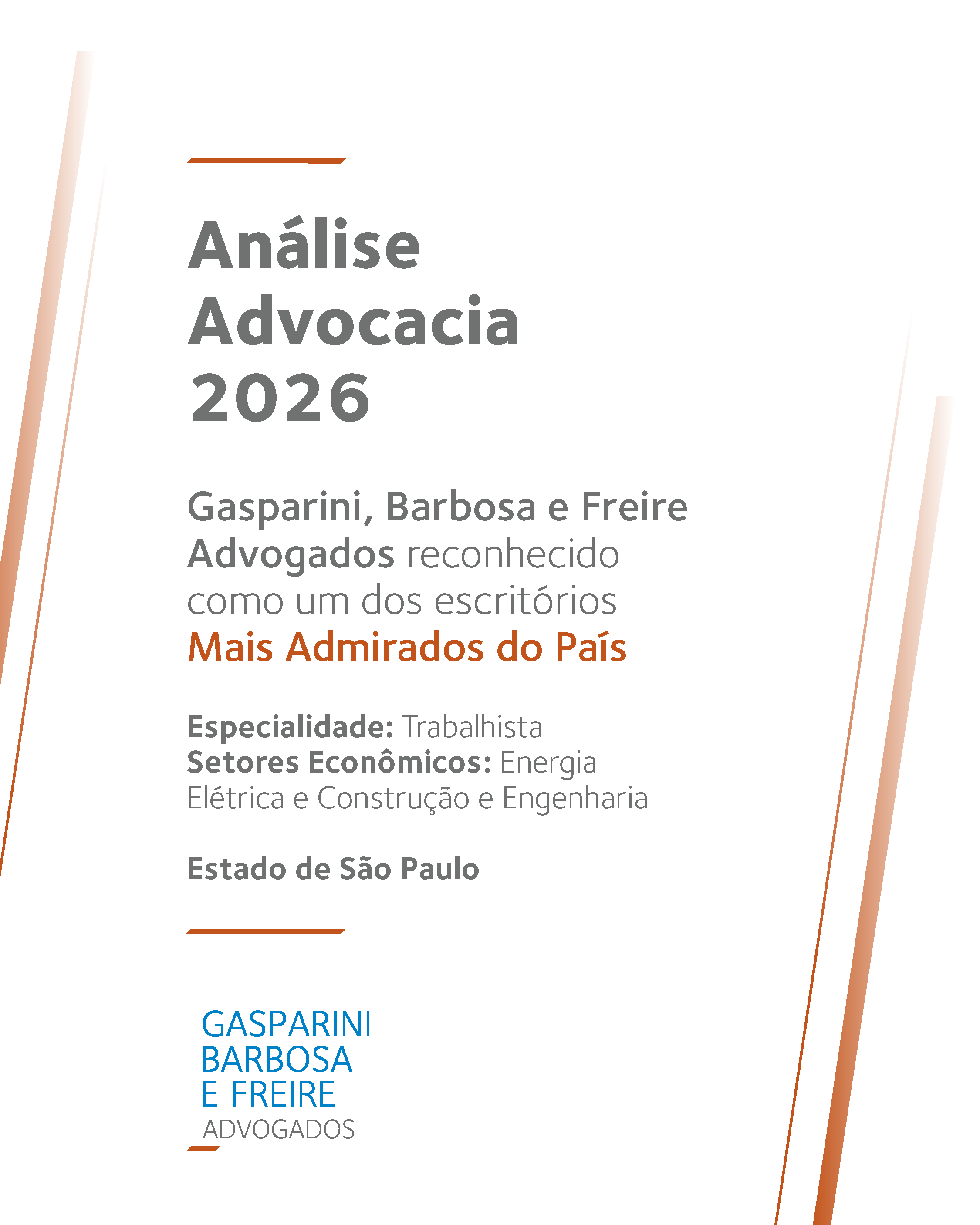 Gasparini, Barbosa e Freire Advogados foi reconhecido novamente como um dos Escritórios Mais Admirados pela Análise Advocacia na especialidade Trabalhista, setores de Energia Elétrica e Construção e Engenharia e no estado de São Paulo. Nossos profissionais também foram nomeados como Advogados Mais Admirados. O sócio Ricardo da Rocha Freire, na área Trabalhista e setores de
