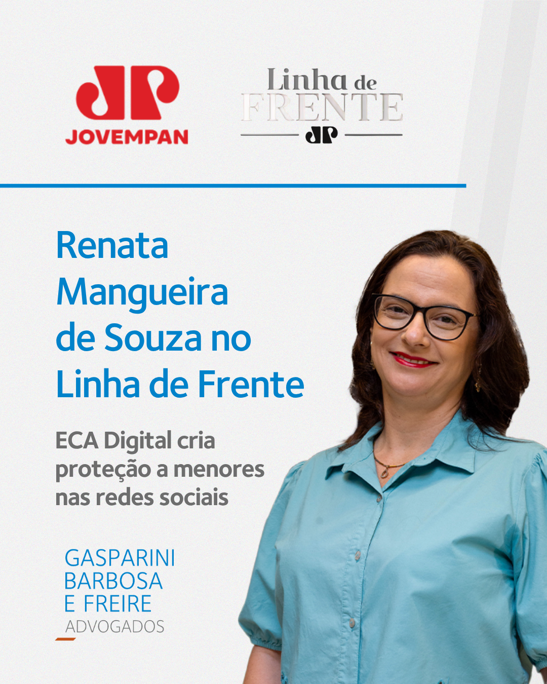A sócia do escritório Gasparini, Barbosa e Freire Advogados, Renata Mangueira de Souza, participou do programa Linha de Frente, da Jovem Pan News, onde analisou os impactos do ECA Digital, cuja legislação entrou em vigor na última semana, além de comentar temas relevantes da conjuntura nacional.