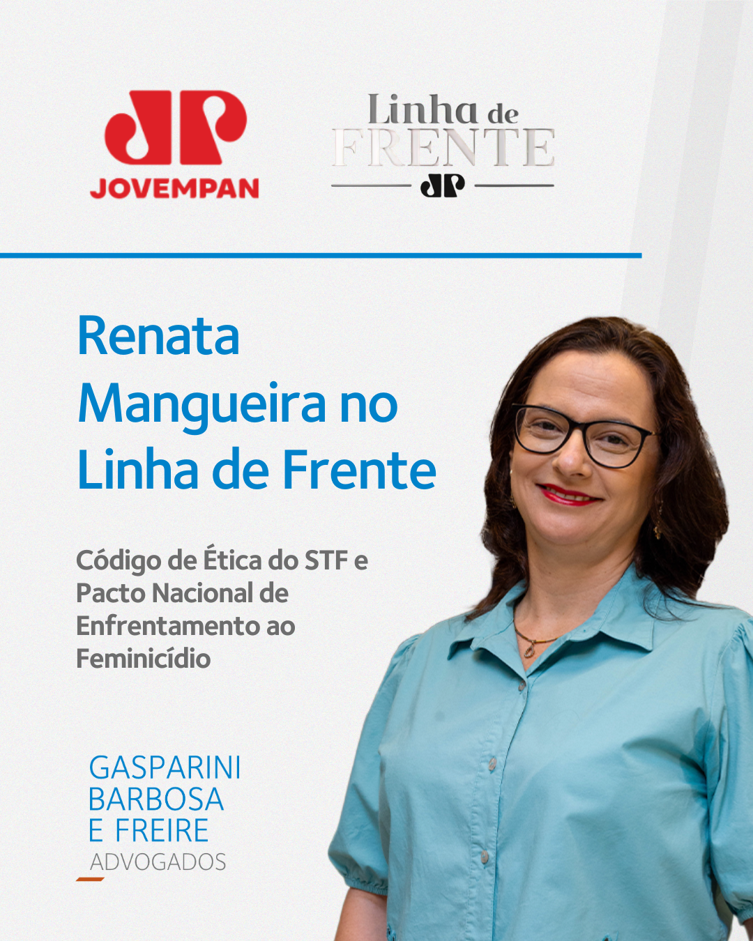 A sócia de Gasparini, Barbosa e Freire Advogados, Renata Mangueira, participou do programa Linha de Frente, da Jovem Pan, para analisar marcos recentes da conjuntura institucional brasileira, com destaque para o Código de Ética do Supremo Tribunal Federal e o Pacto Nacional Brasil de Enfrentamento ao Feminicídio.